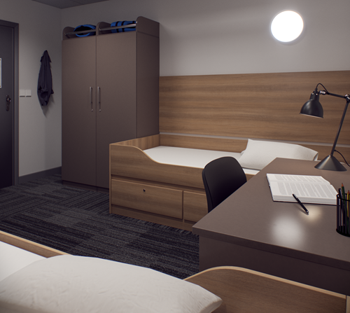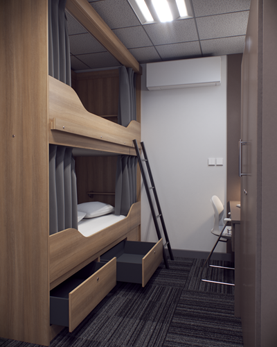 The basic package comprises all the essentials, including single or double bunk beds, a desk and a one or two door locker. This can be upgraded with optional extras, such as drawers, bunk shelves, bunk bed ladders, grab bags and décor gables. All components are fully compliant with relevant industry regulations, including NORSOK standards.
